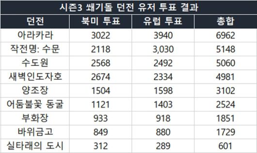 메아리의 도시 아라카라가 1위를 차지한 가운데, '작전명: 수문', '신성한 불꽃의 수도원', '새벽인도자호' 등 인기 던전이 이름을 올렸다. 대부분 최상급 장신구가 드롭되는 던전들이 유저의 선택을 받았다.