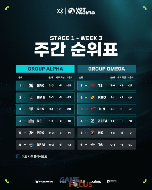 5대5 대전형 캐릭터 기반 전술 슈팅 게임 '발로란트'의 개발 및 유통사인 라이엇 게임즈(한국 대표 조혁진)는 5일(토)부터 7일(월)까지 서울 마포구 상암동에 위치한 상암 SOOP 콜로세움에서 열린 VCT 퍼시픽 스테이지 1 3주 차에서 T1과 DRX가 각각 팀 시크릿과 글로벌 이스포츠를 격파하면서 3전 전승을 달성, 플레이오프 티켓을 손에 넣었다고 밝혔다.