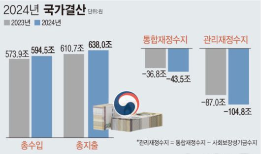 실질적인 재정 상태를 보여주는 관리재정수지는 104조8000억 원 적자였다. 코로나19 당시인 2020년(-112조 원)과 2022년(-117조 원)에 이어 3번째로 큰 규모다.