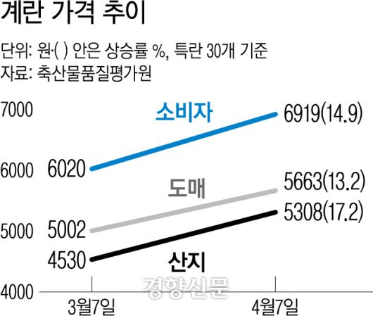 8일 축산물품질평가원 축산유통정보에 따르면 전날 기준 계란 한 판(특란 30개) 소비자가격은 6919원으로, 지난달 7일(6020원) 대비 14.9% 올랐다. 같은 기간 산지가격은 4530원에서 5308원으로 17.2%, 도매가격은 5002원에서 5663원으로 13.2% 각각 상승했다.