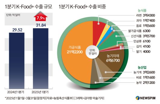 8일 농림축산식품부에 따르면 올해 1분기 K-푸드 플러스 수출액(잠정)은 지난해보다 7.9% 증가한 31억8000만달러(약 4조6650억원)로 집계됐다.