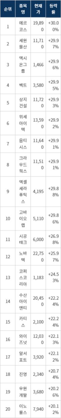 6위 위세아이텍(065370)은 종가 13,590원으로 29.92% 폭등 마감했다. 7위 옵티시스(109080)는 종가 11,640원으로 29.91% 폭등 마감했다. 8위 크라우드웍스(355390)는 종가 11,510원으로 29.91% 폭등 마감했다. 9위 엑셀세라퓨틱스(373110)는 종가 4,195원으로 29.88% 폭등 마감했다. 10위 고바이오랩(348150)은 종가 5,110원으로 29.86% 폭등 마감했다.