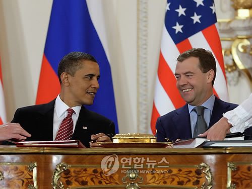 2010년 뉴스타트 체결한 버락 오바마 전 미국 대통령과 드미트리 메드베데프 전 러시아 대통령 |