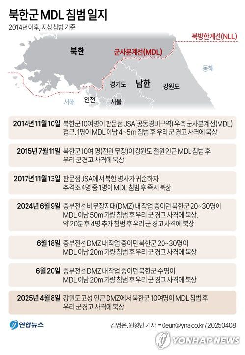 (서울=연합뉴스) 김철선 기자 = 북한군 10여명이 8일 군사분계선(MDL) 이남으로 침범했다가 우리 군의 경고사격 뒤 북상했다.