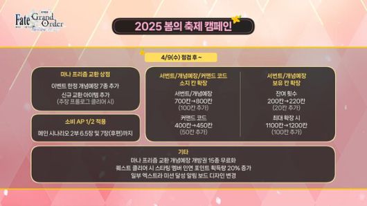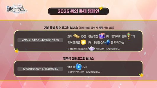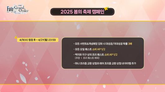 1부에서는 2025 봄의 축제 소식이 전해졌다. 해당 이벤트에서는 성정석, 영맥석 등 다양한 보상이 제공되고 구세주 토네리코, 노크나레아 등 다양한 서번트가 픽업으로 등장한다.
