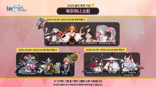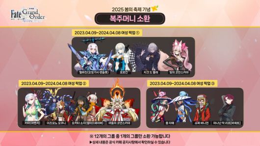 서번트가 업데이트 기간 및 성별에 따라 12그룹으로 나뉘어 등장한다. 12개의 그룹 중 1개의 그룹만 소환 가능하다.