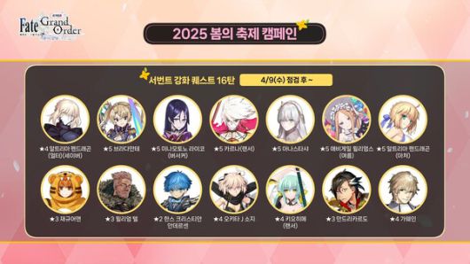 4월 9일 점검이 끝나면 알트리아 펜드래곤(얼터)(세이버), 브라다만테, 미나모토노 라이코(버서커), 카르나(랜서), 아나스타샤 등 총 14종의 서번트에 강화 퀘스트가 추가된다.