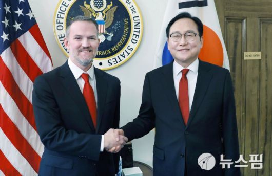 정인교 산업통상자원부 통상교섭본부장이 14일(현지시간) 미국 워싱턴 D.C.를 방문해 제이미슨 그리어 USTR 대표와 면담한 후 기념사진을 찍고 있다. [사진=산업통상자원부] 2025.03.15 dream@newspim.com |
