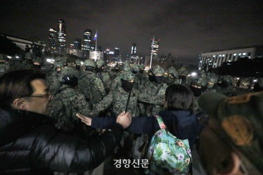 윤석열 전 대통령의 비상계엄 선포로 계엄군이 지난해 12월4일 서울 여의도 국회 본관으로 진입을 시도하자 시민들이 서로 손을 잡고 저지하고 있다. 한수빈 기자 |