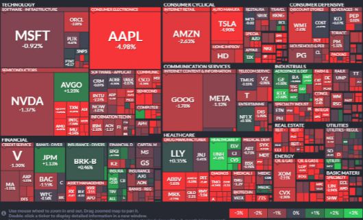 매그니피센트 7은 또다시 일제히 하락했다. 애플이 4.98% 급락하며 가장 타격이 컸다. 애플은 4거래일 연속 급락했고, 시가총액은 2조5900억달러까지 떨어지며 시총 2위로 밀려났다. 애플은 4거래일간 손실이 거의 23%에 달한다. 테슬라도 4.9% 하락한 가운데 아마존(-2.62%), 엔비디아(-1.37%), 알파벳(-1.78%), 메타(-1.12%) 모두 하락 반전 마감했다.