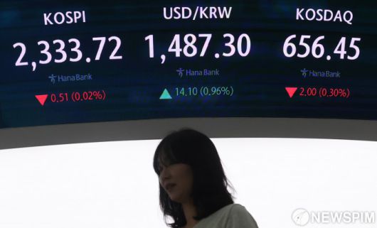[서울=뉴스핌] 양윤모 기자 = 트럼프 행정부가 한국에 25%의 상호관세를 발효하는 9일 오전 코스피 지수가 전 거래일 종가보다 0.51포인트(0.02%) 내린 2,333.72로, 코스닥 지수는 2.00포인트(0.30%) 내린 656.45로 거래를 시작했다. 서울 외환시장에서 원/달러 환율은 전 거래일보다 14.10원 오른 1,487.30원에 거래되는 가운데, 서울 중구 하나은행 딜링룸에서 직원들이 업무를 보고 있다. 2025.04.09 yym58@newspim.com |
