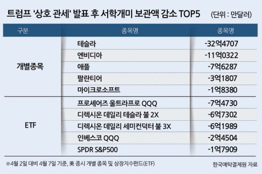 지난 7일 기준으로 미국 주식 보관금액 상위 30개 종목의 총 보관금액은 595억6461만달러(약 88조5368억원)로 트럼프 대통령의 ‘상호 관세’ 발표가 미 증시에 영향을 미치기 전인 지난 2일 695억5502만달러(약 103조3876억원)와 비교했을 때 99억9041만달러(약 14조8508억원)나 줄어든 것으로 나타났다.