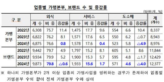 업종별로 보면 브랜드 수는 외식(-0.6%) 및 도소매(-4.0%) 업종에서 감소했고, 서비스(1.7%) 업종은 소폭 증가했다. 가맹점 수는 외식(0.6%), 도소매(1.1%), 서비스(10.0%) 업종 모두 전년 대비 증가했다. 외식 업종 브랜드 수는 9873개로 전년(9934개) 대비 0.6% 감소했으나, 가맹점 수는 18만942개로 전년(17만9923개) 대비 0.6% 증가했다.