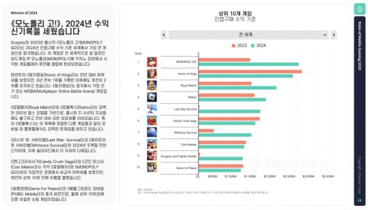 전 세계 인앱구매 수익 상위 게임 순위에서는 Scopely의 ‘모노폴리 고!(Monopoly GO!)’가 2024년 수익 1위를 기록했다. 텐센트의 ‘왕자영요’는 전년 대비 하락세를 보였지만 5년 연속 1위를 차지한 이후 여전히 2위에 이름을 올렸다. 이외에도 ‘로얄매치’, ‘로블록스’, ‘라스트 워: 서바이벌’, ‘화이트아웃 서바이벌’ 등이 강력한 라이브 서비스 운영을 기반으로 지속적인 성장세를 이어갔다.