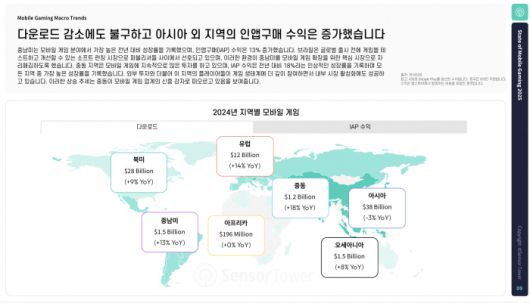 지역별 시장에서는 중남미와 중동의 성장이 두드러졌다. 중남미는 전년 대비 13%의 인앱구매 수익 증가율을 기록하며 브라질을 중심으로 퍼블리셔의 ‘소프트 론칭’ 거점으로 떠오르고 있다. 중동 지역은 18%의 성장률을 보이며 가장 높은 수치를 기록했고, 이는 외부 투자 유입과 내수 시장 활성화의 성과로 분석된다.