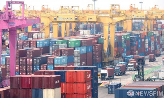 [인천=뉴스핌] 김학선 기자 = 미국의 상호관세가 발효된 9일 인천 연수구 인천신항에 컨테이너들이 쌓여있다. 도널드 트럼프 미국 행정부는 지난 5일 전 세계에 적용한 10%의 기본 관세에 더해 이날 오후 1시1분(미국 동부시간 9일 오전 0시1분)부터 한국을 비롯해 80여 개 국가에 대해 최소 11%에서 최고 50%의 국가별 상호관세를 부과하기 시작했다. 한국의 미국 수출품에는 25%의 관세가 붙게 돼 수출 중심 경제 체제로 미국 시장의 비중이 큰 한국은 대미 수출에 비상이 걸렸다. 2025.04.09 yooksa@newspim.com