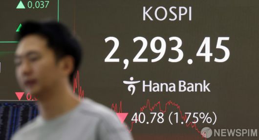 9일 한국거래소에 따르면 코스피 지수는 오후 2시 7분 기준 전일 대비 1.88% 떨어진 2290.36에 거래되고 있다.