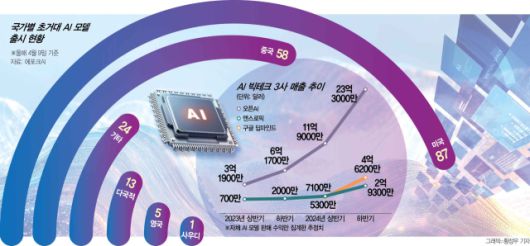 한국 기업들은 수익뿐만 아니라 기술력 면에서도 에포크AI 보고서에 이름조차 올리지 못했다. 에포크AI가 최근 업데이트한 국가별 초거대 인공지능(AI) 모델 통계에서 한국은 ‘기타’로 분류됐다. 웹상에서 설정을 미세하게 조정해야 한국의 국가명이 나타났다. 선두를 달리고 있는 미국(87개), 중국(58개)과 비교조차 어려운 수준이다. 에포크AI의 통계는 미국 스탠퍼드대 인간중심인공지능연구소(HAI)가 매년 발간하는 ‘AI 인덱스’ 보고서에 원데이터로 사용될 정도로 공신력이 있는 자료다. 이러한 자료에서 언급이 안 된 것은 글로벌 AI 시장에서 한국 기업들의 존재감이 상당히 부족하다는 신호로 해석된다.