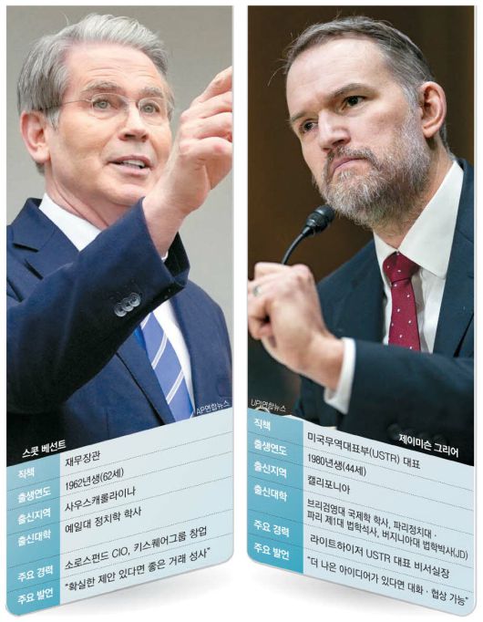 한덕수 대통령 권한대행 국무총리와 도널드 트럼프 미국 대통령이 첫 한미 정상 통화를 하고 정인교 통상교섭본부장이 미국을 방문하는 등 관세를 둘러싼 양국의 협상이 무르익어가는 가운데 미국 측 협상의 '키 맨'이 누구인지에 관심이 모아지고 있다. 캐럴라인 레빗 백악관 대변인은 8일(현지시간) 브리핑에서 "트럼프 대통령은 스콧 베선트 재무장관과 제이미슨 그리어 미국무역대표부(USTR) 대표에게 이 대화(협상)를 주도하도록 지시했다"고 밝혔다.