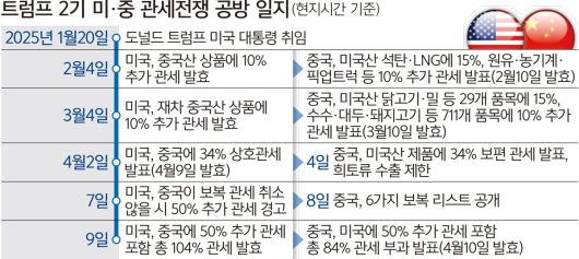 9일(현지시간) 트럼프 행정부의 대(對)중국 상호관세가 발효되면서 중국산 제품에 적용되는 총 추가 관세는 104%가 됐다. 트럼프 대통령은 중국에 펜타닐 유입 차단 미협조 명분으로 2월과 3월 각각 10%씩의 관세를 추가로 부과했다. 이에 중국은 미국산 석탄·LNG와 원유·농기계, 닭고기·밀 등 특정 품목에 대한 추가 관세를 발표하며 맞섰다. 그러자 미국은 지난 2일 34%의 상호관세를 더한다고 발표했는데, 중국 역시 물러서지 않고 이틀 후인 4일 34%의 보복관세를 동일하게 미국산 전 제품에 적용한다고 밝힌 데 이어 WTO에 정식으로 분쟁협의를 요청했다. 트럼프 대통령은 중국이 보복관세를 취소하지 않으면 관세 50%를 추가로 부과한다고 경고했고, 결국 현실화했다. 중국은 이마저 즉각 맞받아쳤다. 중국 국무원 관세세칙위원회는 이날 “10일 낮 12시1분(현지시간)을 기점으로 부과하는 모든 미국산 수입품에 대한 (추가) 관세율을 34%에서 84%로 인상한다”고 발표했다. 미국의 50% 추가 관세 부과를 그대로 돌려준 것이다.