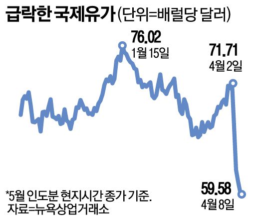 8일(현지시간) 미국 뉴욕상업거래소에서 서부텍사스산원유(WTI) 5월 인도분 선물은 전장 대비 2.22% 하락한 배럴당 59.10달러를 기록했다. 이는 2021년 4월 이후 약 4년 만의 최저치다. 미국 도널드 트럼프 전 행정부 시절의 상호관세와 그에 따른 보복관세가 원유 수요 위축으로 이어질 것이란 전망이 유가 하락을 부채질했다. 결국 공급량에 비해 수요 둔화 가능성이 가격하락의 결정타가 된 셈이다.