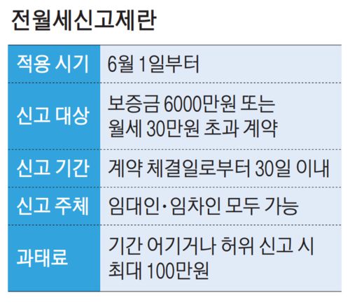 보증금이 6000만원을 넘거나 월세가 30만원을 초과하는 경우 계약일로부터 30일 안에 임대인과 임차인이 계약 내용을 지방자치단체에 신고해야 한다. 기간 안에 신고하지 않거나 허위로 신고하면 최대 100만원의 과태료를 내야 한다.