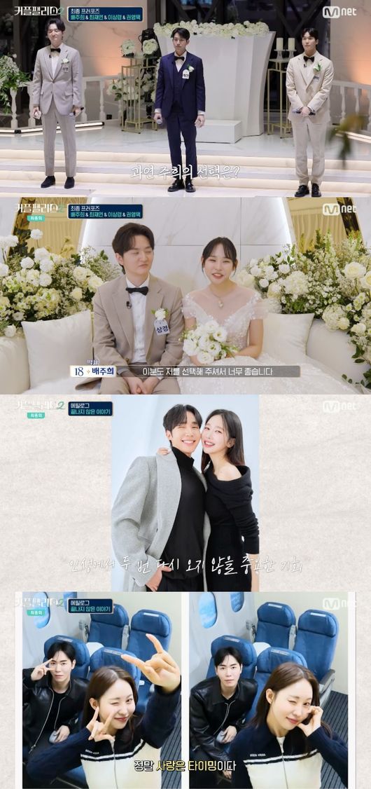 끝내 배주희는 최종 커플 선택으로 이상경을 선택했다. 예상치 못한 선택해 모두가 충격을 받았고, 이상경 역시 무거운 마음으로 배주희를 마주봤다. 그는 “재연이의 마음도 상처 입지 않았으면 좋겠고 주희 님도 상처를 입지 않았으면 좋겠다”라면서도 “우리 정말 힘들었고 고민 많이 했습니다. 그럼에도 많이 웃었고 많이 즐거웠고 많이 행복했습니다. 나랑 평생 웃으러 갈 준비 됐어요?”라고 고백했다.