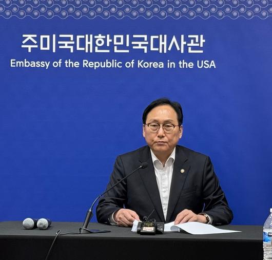 미국을 방문 중인 정인교 산업부 통상교섭본부장이 9일 워싱턴 DC 주미 한국대사관에서 특파원 간담회를 갖고 있다. /워싱턴=김은중 특파원 |