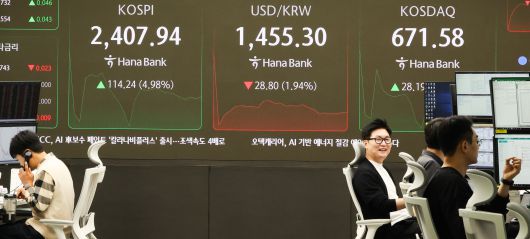 이날 오전 10시 40분 기준 코스피지수는 전 거래일 대비 1116.07포인트(5.06%) 오른 2409.73을 기록하고 있다. 지수는 전날보다 101.43포인트(4.42%) 오른 2395.13으로 출발한 뒤 급등세를 유지 중이다. 장 초반 2420선을 터치하기도 했다.