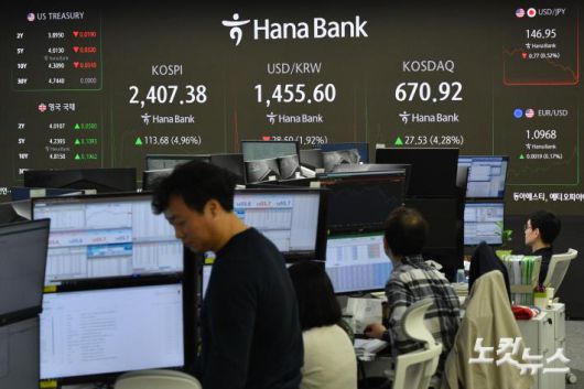 도널드 트럼프 미국 대통령의 '상호관세 90일 유예 발표'에 코스피 지수가 급등하면서 유가증권시장에서 사이드카(프로그램매매 매수호가 효력정지)가 발동된 가운데 10일 오전 서울 중구 하나은행 딜링룸 전광판에 지수가 표시돼 있다.저작권자 © CBS 노컷뉴스 무단전재 및 재배포 금지