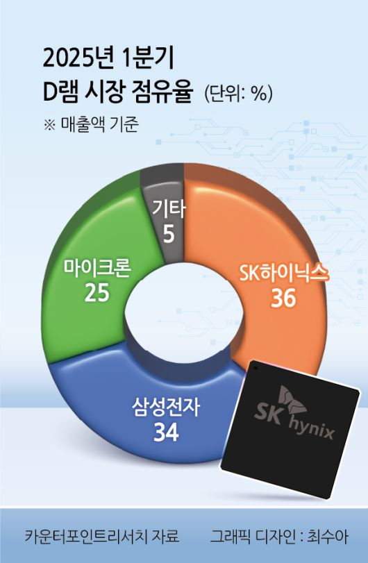 10일 시장조사업체 카운터포인트리서치에 따르면 SK하이닉스는 올 1분기 D램 시장 점유율 36%(매출액 기준)로 처음 1위에 올랐다. 삼성전자가 34%, 마이크론이 25%로 뒤를 이었다.