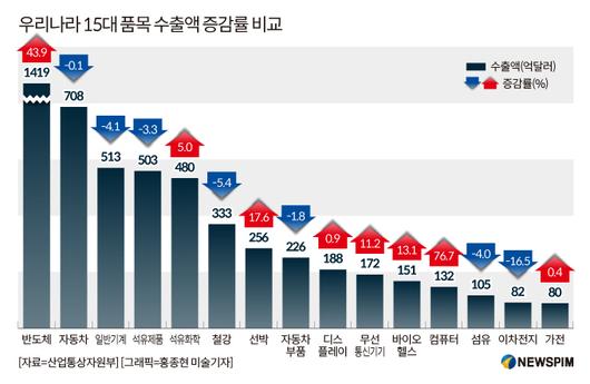 실제로 우리나라의 지난해 반도체 수출액은 1419억달러로 전체 수출액(6838억달러)의 20.8%를 차지했다. 자동차 수출액(708억달러, 10.4%)의 두 배를 웃도는 규모다(그래프 참고).