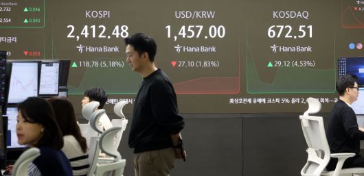 코스피가 전 거래일(2293.70)보다 101.43포인트(4.42%) 상승한 2395.13에 개장한 10일 오전 서울 중구 하나은행 딜링룸 전광판에 지수가 표시되고 있다. 코스닥 지수는 전 거래일(643.39)보다 26.73포인트(4.15%) 오른 670.12에 거래를 시작했다. 서울 외환시장에서 원·달러 환율은 전 거래일 주간거래 종가(1484.1원)보다 38.1원 내린 1446.0원에 주간 거래를 시작했다. 2025.04.10. [서울=뉴시스] |