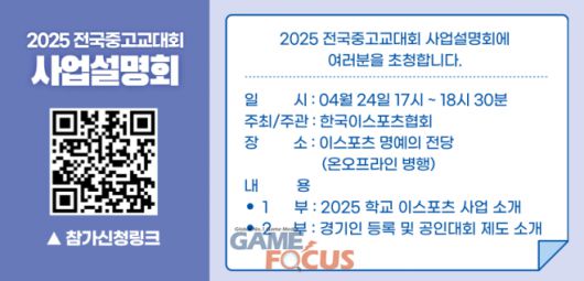 한국e스포츠협회(이하 협회)가 오는 4월 24일(목) ‘2025 전국중고교대회 사업설명회’를 개최한다고 10일(목) 밝혔다.