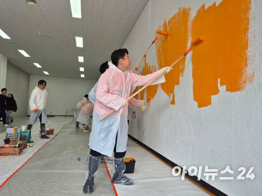 이준석 개혁신당 대선 후보가 10일 서울 강남역 인근 1층에 마련된 선거 사무실의 벽을 당의 상징인 '오렌지'색으로 칠하고 있다. [사진=김주훈 기자] |