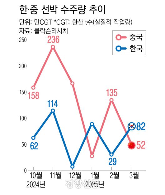 영국의 조선·해운시황 분석기관 클락슨리서치에 따르면 지난달 전 세계 선박 발주량 150만CGT(표준선 환산 t수) 가운데 한국은 82만CGT(55%)를 수주해 중국(52만CGT·35%)을 제치고 수주량 1위를 차지했다. CGT는 건조할 배의 종류와 난이도, 필요한 자원 등을 반영한 수치로 조선업계에서 실적을 따질 때 보는 핵심 지표다.