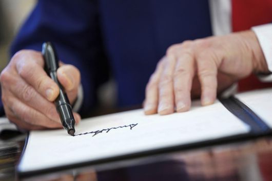 9일(현지시간) 도널드 트럼프 미국 대통령이 행정명령에 서명하고 있다. AP연합뉴스 |