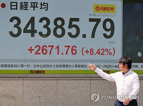 (도쿄=연합뉴스) 경수현 박상현 특파원 = 일본 증시 대표 주가지수인 닛케이225 평균주가(이하 닛케이지수)가 10일 미국의 국가별 상호관세 90일간 유예 발표에 9.13% 급등했다.