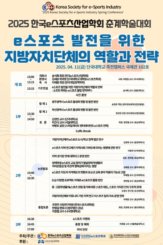 한국e스포츠산업학회는 단국대학교와 공동으로 '2025 한국e스포츠산업학회 춘계학술대회'를 11일 단국대학교 죽전캠퍼스 국제관 102호에서 개최한다고 밝혔다.