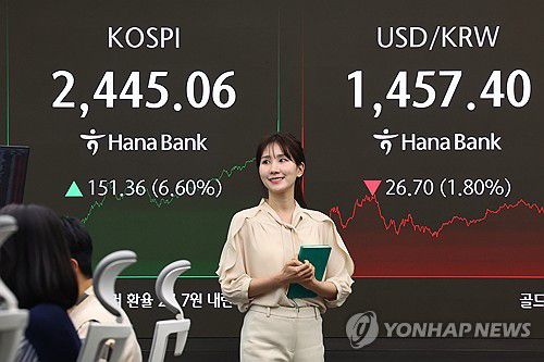 한국거래소에 따르면 이날 코스피 종가는 전 거래일 대비 151.36포인트(6.60%) 치솟은 2,445.06으로 집계됐다.