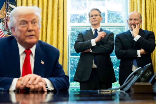 이 또한 전략? 도널드 트럼프 미국 대통령이 9일(현지시간) 백악관 오벌오피스에서 행정명령에 서명한 후 기자들 질문에 답하고 있다. 스콧 베선트 재무부 장관(가운데)과 하워드 러트닉 상무장관이 배석해 있다. AFP연합뉴스 |