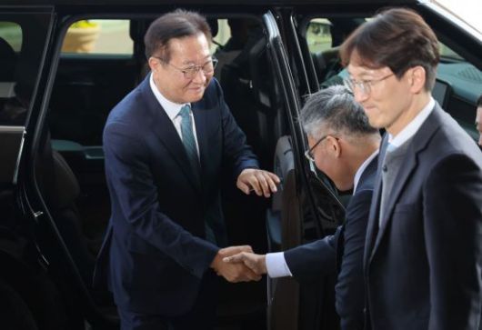 박성재 법무부 장관이 10일 과천 법무부 청사로 출근하며 김석우 차관과 인사하고 있다. 헌법재판소는 이날 박 장관에 대한 국회의 탄핵소추를 기각했다. 연합뉴스 |