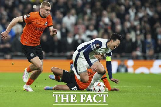 토트넘의 '캡틴' 손흥민이 11일 프랑크푸르트와 2024~2025 UEL 8강 1차전 홈 경기에서 상대의 거친 수비에 고통스러워하고 있다./런던=AP.뉴시스 |