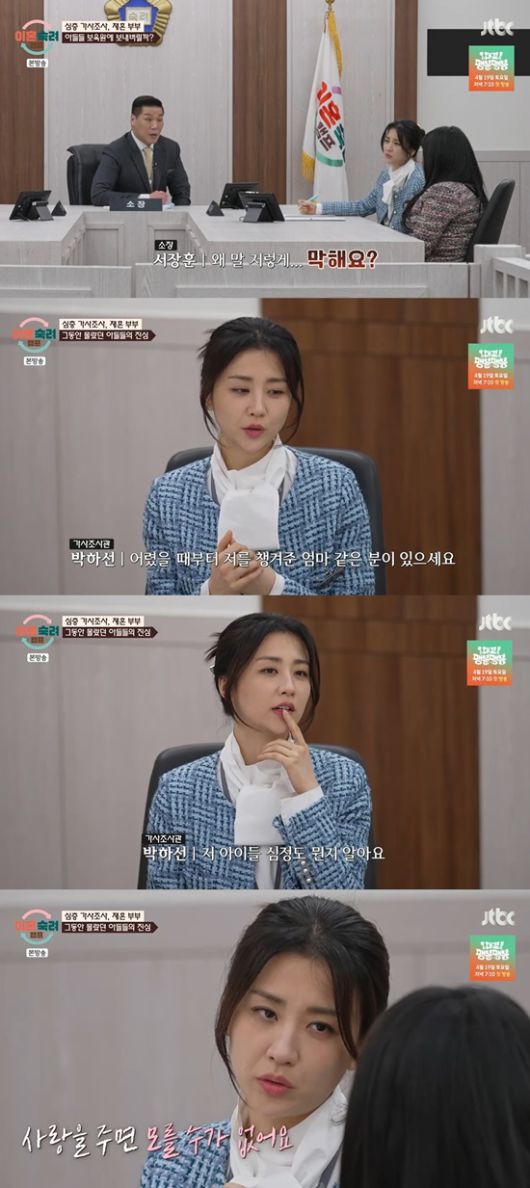 오열한 아내에게 박하선은 "저도 저를 어렸을 때부터 챙겨주신 엄마 같은 분이 계셔서 공감이 됐다. 그 분이 생각나더라. 아이들 심정도 뭔지 안다. 사랑을 주면, 모를 수가 없다. 그동안은 스트레스 받아서 그랬던 것 아니냐"며 아내의 마음을 헤아렸다.
