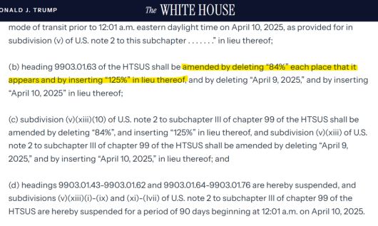 백악관이 전날 공개한 트럼프 대통령의 ‘무역 파트너의 보복과 지지를 반영하기 위한 상호관세율 수정’이라는 제목의 행정명령을 보면, 대중 상호관세율과 관련한 부분에서 ‘84%를 삭제하고 이를 125%로 대체한다’고 적혀있다.