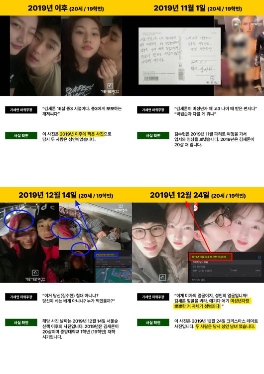 2019년 김수현도, 김새론도 각자 애인이 있었다는 주장. 2019년 김새론의 키스영상이라고 주장하는 자료도 공개했다. 김수현 측은 김새론과 2019년 여름부터 2020년 가을까지 교제했다고 밝힌 바 있다. 이에 더해 소속사 측은 2019년 김수현, 김새론 볼뽀뽀 사진, 파리 엽서, 김새론 수면 사진 등에 대해 "두 사람은 당시 성인"이라고 밝히며 해명한 바 있다.