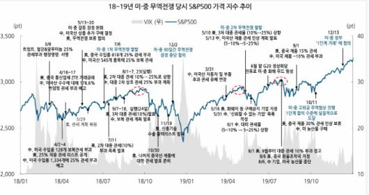 그 과정에서 S&P500은 3차례 단기 고점 형성 후 피크아웃을 경험했다는 것이 우 연구원의 설명이다. 양국 간 갈등이 고조됐을 때는 무역전쟁 시작 이후 저점을 하회하기도 했다.