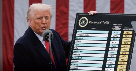 도널드 트럼프 미국 대통령이 4월 2일 백악관 로즈가든에서 차트를 들고 상호 관세 부과에 대해 발표하고 있다. /사진= 로이터연합 |
