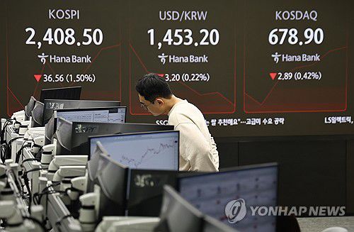 이날 오전 9시 2분 현재 코스피 지수는 전 거래일 대비 37.57포인트(1.54%) 내린 2,407.49를 나타냈다.