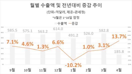 관세청은 4월1~10일 수출액이 186억달러(약 27조원·통관기준 잠정)로 지난해 같은 기간보다 13.7% 증가했다고 11일 밝혔다.